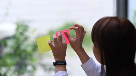 Closeup of a glass window covered with assorted sticky notes orange, purple, teal filled with creative ideas and doodles, sunlight streaming through, blurred coworker hands out of focus adding more notes