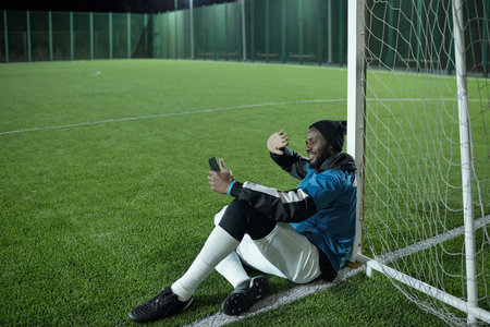 Happy footballer waving hand to someone he communicating with during video call while sitting on the field at stadium