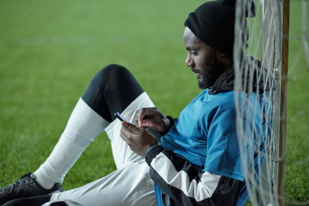 Serious football player in uniform texting in mobile phone while sitting against net on green lawn during break