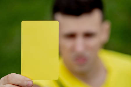 Referee showing a red card to a displeased football or soccer player while gaming. Concept of sport, rules violation, controversial issues, obstacles overcoming.
