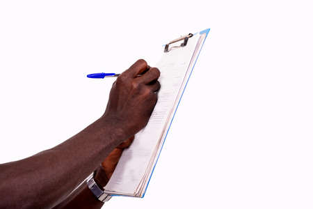 Analyst hands writing notes at factory closeup. Close up unrecognizable african american engineer analyzing results modern facility. Unrecognizable brown skin man use notebook at plant. Data concept