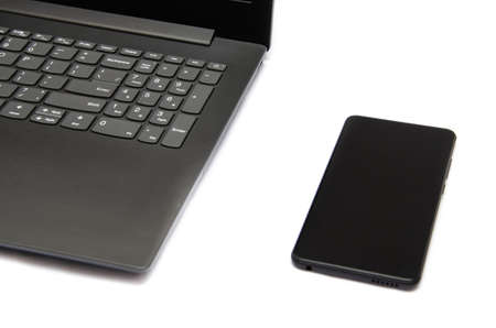 Open laptop part of the keyboard and the screen next to a smartphone with a black screen on a white background. Laptop and smartphone. Smartphone on the main background