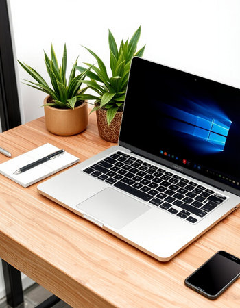 A flat lay of a work space with a mobile phone and a laptop with a plant near them over a wooden table