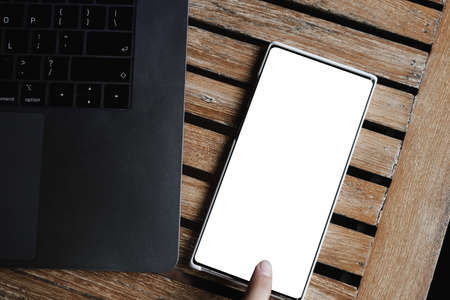 hand holding smart phone with laptop on background, work from home concept