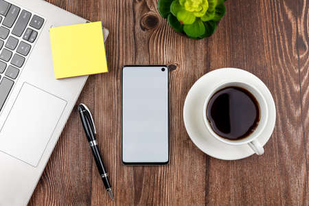 Flat lay lap top computer with cup of coffee and mobile phone on the wooden background.
