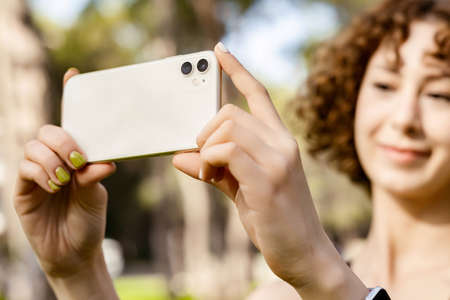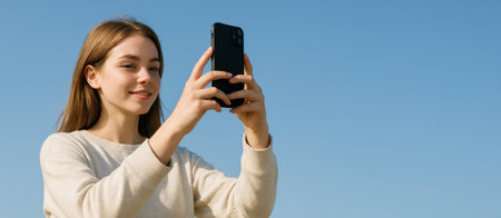 Young caucasian woman taking photos outdoors smartphone photography on a clear day. concept of capturing moments, joyful expression, mobile technology usage, wide banner, copy space.