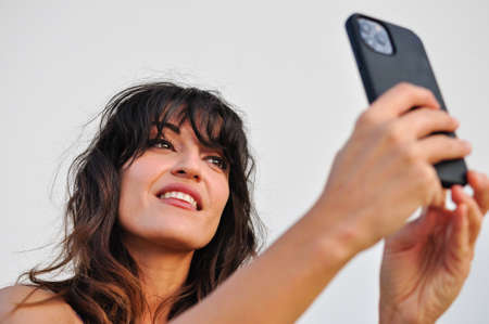 Portrait of young european woman taking selfie with phone on white background