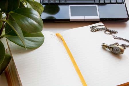 Open notebook with place for text, a clock on a chain and an open laptop on a white background.