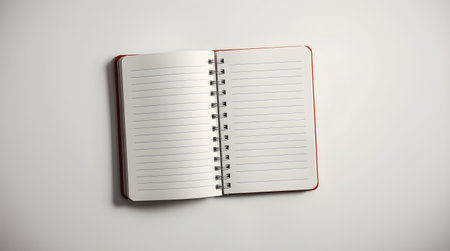 An overhead shot of an open spiral-bound notebook with blank lined pages. The red cover is visible, and the notebook rests on a plain white surface.