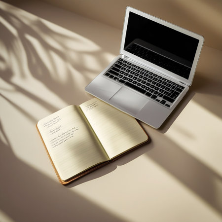 A laptop and an open notebook with handwritten notes are on a surface with dappled sunlight. Clear details and vibrant colors enhance visual appeal.