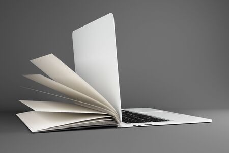 Abstract open book laptop on subtle background with copy space. Mock up, Online education and webinar concept. Mock up, 3D Rendering