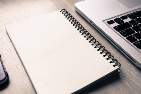Laptop and notepad with blank pages. Blank note paper and laptop. Office desk concept high angle view. Selective focus included