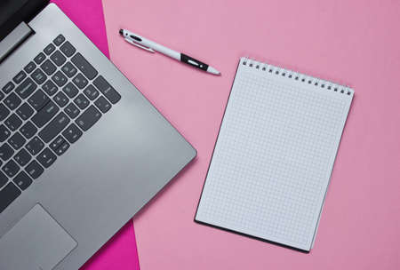Laptop, notebook with pen on a colored paper background. Top view. Studio shot