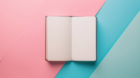 An open blank notebook lies on a pastel pink and blue background, inviting ideas creativity