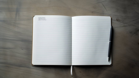 An open notebook with empty pages lies next to a pen, set against a vibrant yellow background. Ideal for writing, planning, and inspiring creativity.