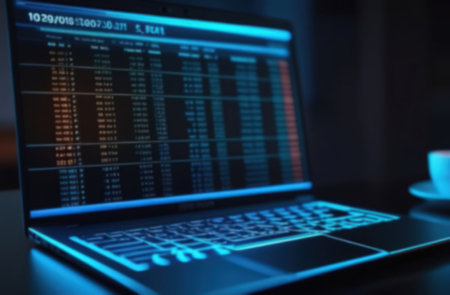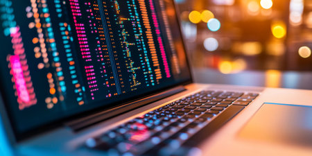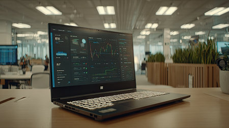 A sleek laptop displays vivid data visualizations in a modern workspace, highlighting analytics and trends. Ideal for finance and tech themes.