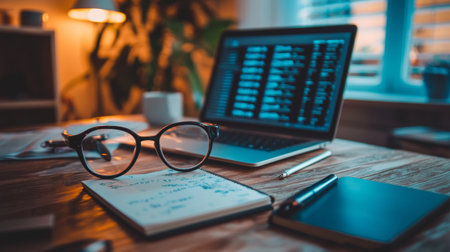 A warm and cozy workspace featuring a laptop with code on screen, a notebook, pen, and glasses, illuminated by soft lighting, perfect for productivity and focus.