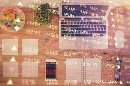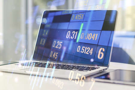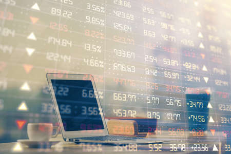 Stock market graph and top view computer on the table background. Multi exposure. Concept of financial education.