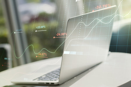 A laptop on a desk with financial graphs and data visualizations on the screen, surrounded by documents and a smartphone. Bright, professional workspace.