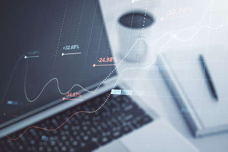 Abstract creative financial graph and modern desktop with pc on background, financial and trading concept. Multiexposure