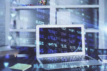 Forex market graph hologram and personal computer on background. Double exposure. Concept of investment.