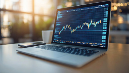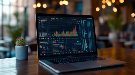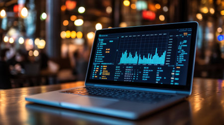 A modern laptop showcases financial charts and data in a warm caf