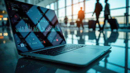A businessman reviews stock market data on his laptop while waiting in a busy airport terminal. He's working productively during his travels, showcasing the modern realities of global finance and the seamless integration of technology into business life. The image depicts a professional, focused atmosphere.