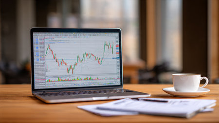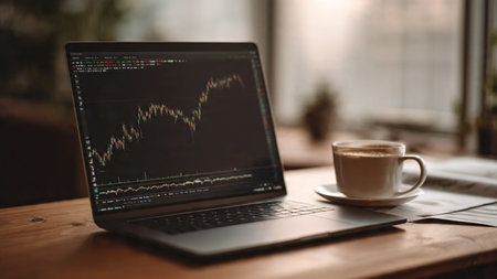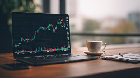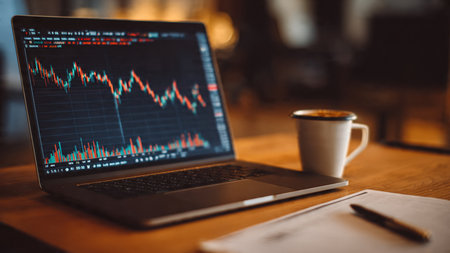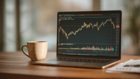 Real-time market indicators glow on a laptop screen while documents and a warm coffee cup complete the workspace.