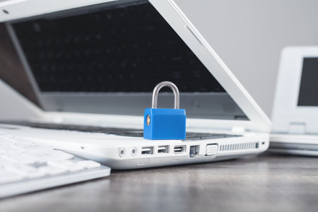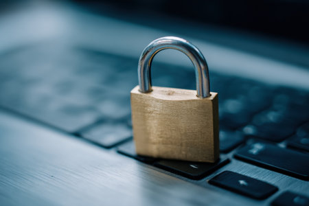 Padlock on laptop keyboard, close-up