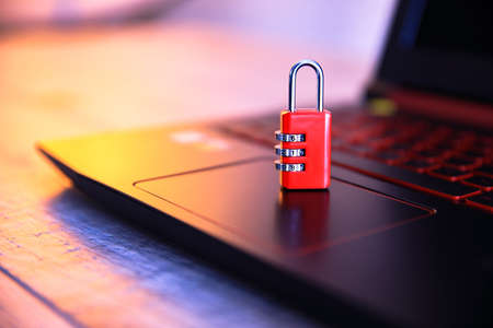 Red ruined padlock on a laptop keyboard. Computer security concept. Copy space.