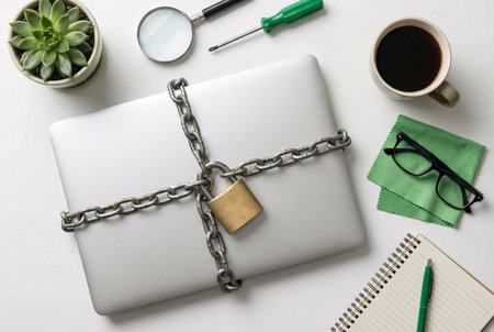 important information locked with chain and padlock, computer and data security concept.