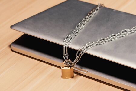 Padlock with chain on a laptop computer. Cyber security abstract concept.
