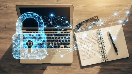 Double exposure of lock hologram drawing over study table background with computer. Concept of data security. Top view.