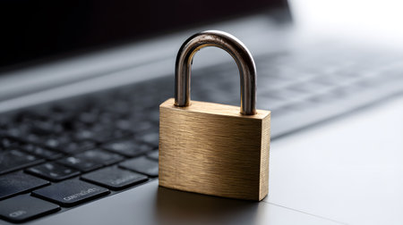 Golden padlock on laptop keyboard, information security protection, password.