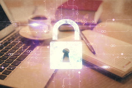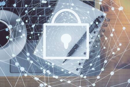 Double exposure of lock drawing over desktop. Top view. Security concept.