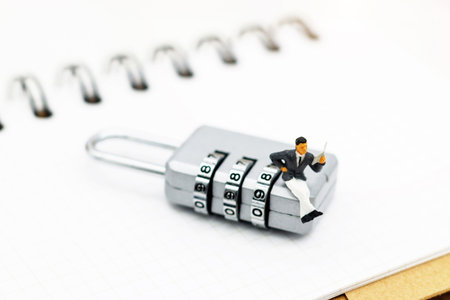 Miniature people are decrypting unlock padlock, Decrypt the key. concept for data security breach, risk and hacker attack.