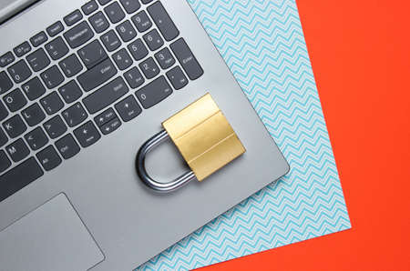 Computer protection concept, internet security. Laptop and lock on orange blue paper background