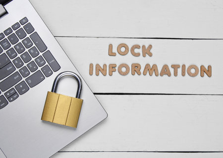 Lock your information. Laptop and Lock on white wooden background. Minimalistic concept. Top view