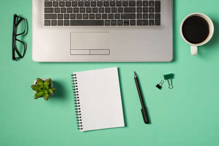 Office desk table with laptop, notebook and coffee cup. Top view with copy space