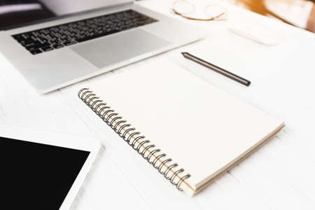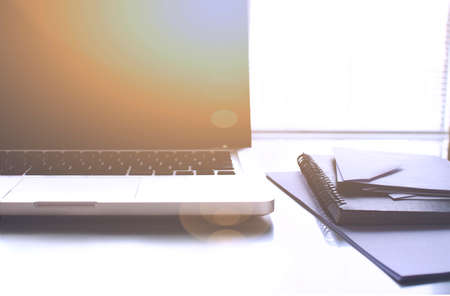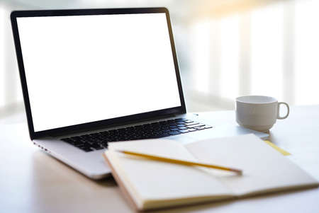 Close-up photo of a workplace, a laptop with a empty white screen, a notepad and a stationery. Copy space