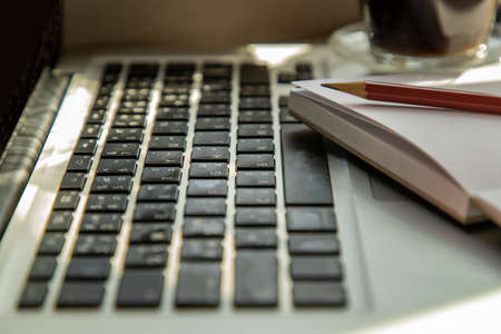Side view with keyboard laptop, notebook with pencil at comfortable office work table. Creative concept. Selective focus.