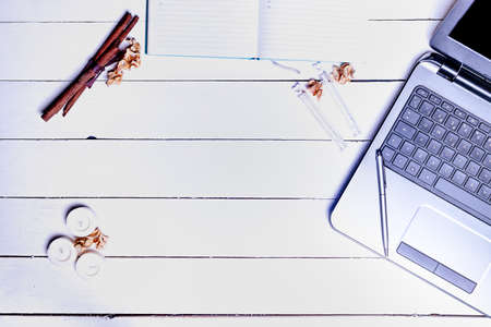 White technological background. top view copy space.Laptop computer on a wooden desk.