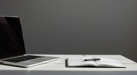 Laptop, notebook and pen on a white table with gray background