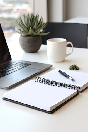 A well-lit image showcases a workspace featuring a laptop, open notebook, and a white coffee mug. The composition includes a succulent plant in a pot, adding a touch of nature. The scene is clean and minimalist, with a neutral color palette suitable for business, lifestyle, or design-related projects.