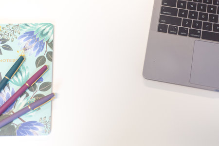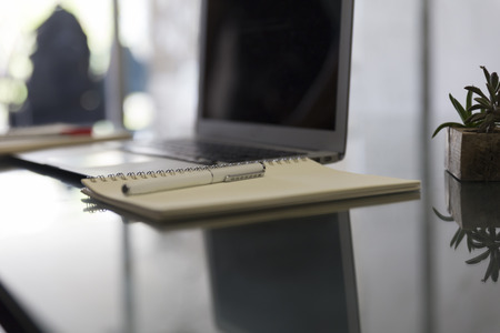 pen, notebook on laptop with blur background
