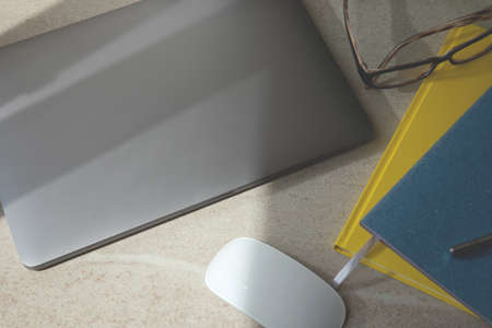 Work table with yellow and blue notebooks, pen, glasses and laptop. Flat lay
