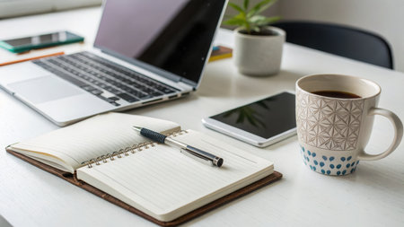 An organized workspace is depicted, featuring a laptop, open notebook with pen, tablet, coffee mug, and small plant. The background is a simple, white table. The scene conveys a calm and productive atmosphere, ideal for work or study. The overall mood is peaceful and focused.