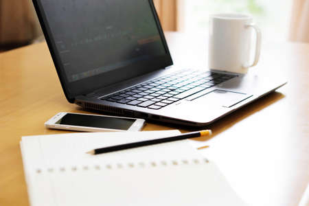 Laptop to work study on work desk. Business, financial, trade stock maket and social network concept.