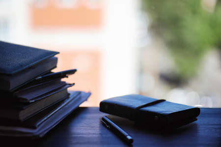 Notebooks on retro wooden table. Business background. Top view