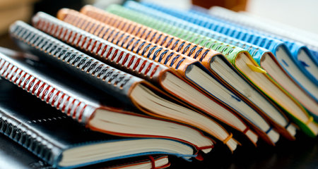 Row of colorful school spiral notebooks with reports and documents on white tile wall background